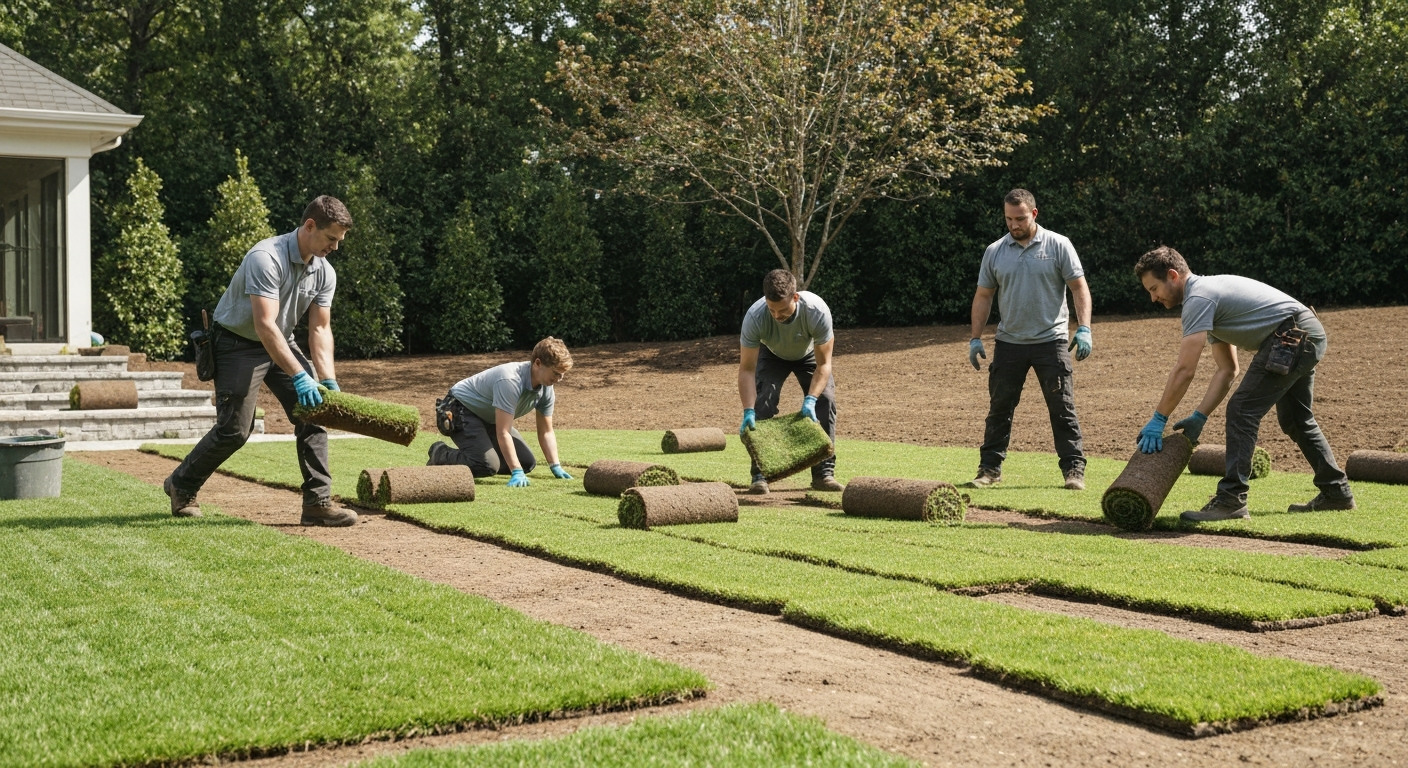 Préparation du sol, nivelage, pose de gazon naturel de qualité supérieure. Résultat immédiat. Garantie d'enracinement incluse.
