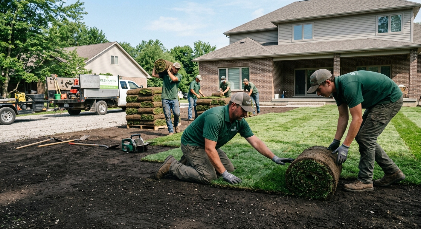 Préparation du sol, nivelage, pose de gazon naturel de qualité supérieure. Résultat immédiat. Garantie d'enracinement incluse.