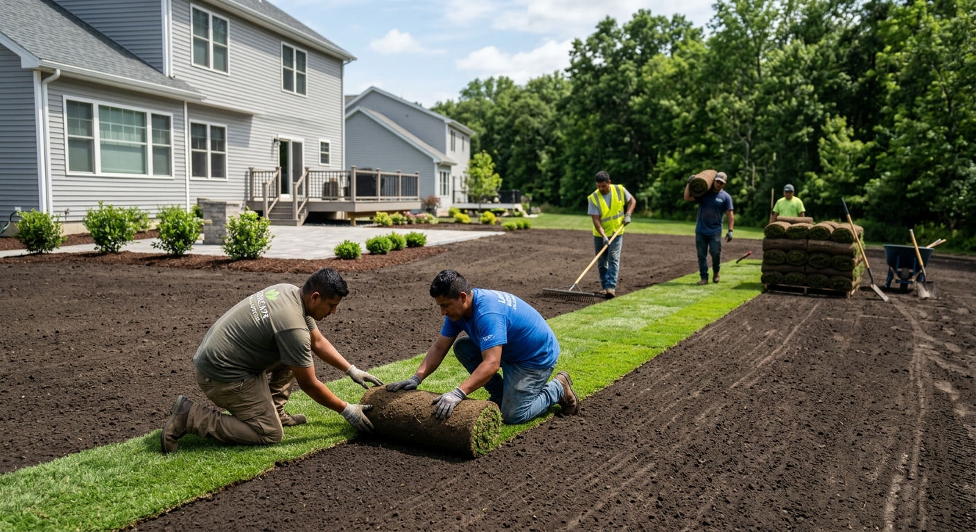 Préparation du sol, nivelage, pose de gazon naturel de qualité supérieure. Résultat immédiat. Garantie d'enracinement incluse.