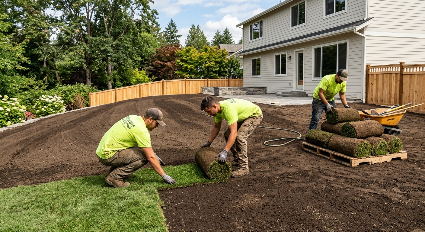Préparation du sol, nivelage, pose de gazon naturel de qualité supérieure. Résultat immédiat. Garantie d'enracinement incluse.